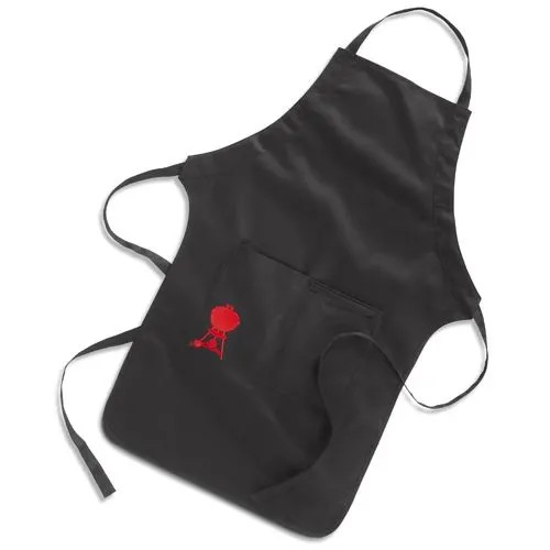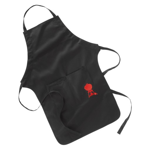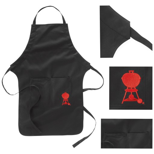 Fartuch marki Weber z kieszeniami i regulacją zapięcia pod szyją w kolorze czarnym z wyszywanym obrazkiem grilla w kolorze czerwonym.