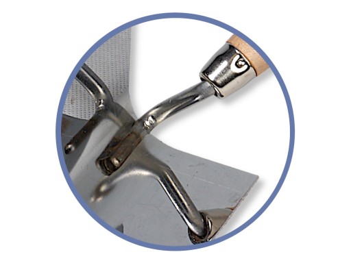 Połączanie trzonka z wewnętrzną częścią kielni za pomocą przyspawanego stalowego gąsiora sprawia, że narzędzie jest niezwykle trwałe i wygodne, co umożliwia precyzyjnie używać narzędzia, bez obawy o uszkodzenia. Metalowe ściany kielni ułożone są względem siebie pod kątem 90 stopni, dzięki czemu możliwe jest precyzyjne kształtowanie kątów prostych.