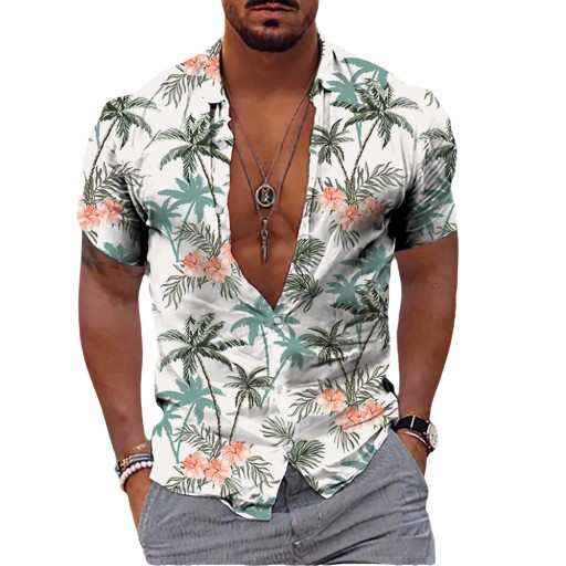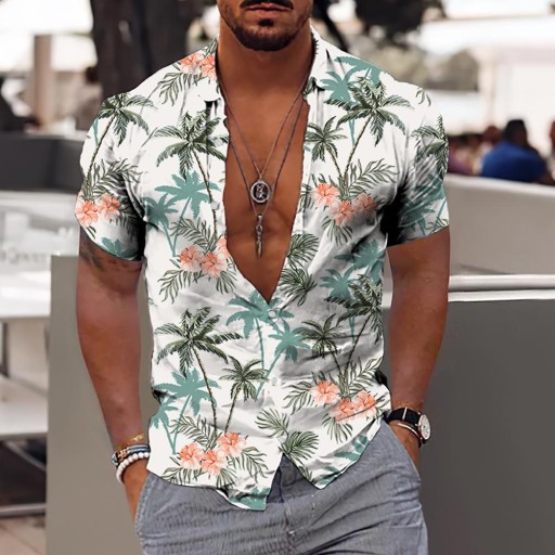 MODNA MĘSKA KOSZULA W PALMY Z KRÓTKIM RĘKAWEM KWIATY KOLORY LATO
