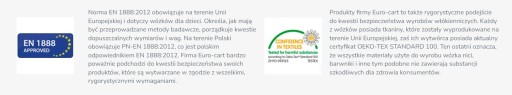 Wózek spełnia najnowsze normy bezpieczeństwa dla wózków dziecięcych EN 1888-1:2012 i EN 1888-2:2018, a także rygorystyczne wytyczne dla wyrobów tekstylnych OEKO-TEX STANDART 100.