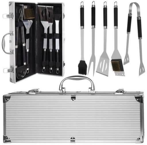 Zestaw przyborów do grilla jest umieszczony w solidnej aluminiowej walizce, zapewniającej nie tylko bezpieczne przechowywanie narzędzi, ale także wygodny transport.