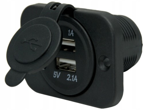 Gniazdo ładowania USB podwójne. Wykonane z tworzywa sztucznego. Dzięki zastosowaniu elastycznej klapki gniazdo jest bryzgoszczelne i może być stosowane na zewnątrz.