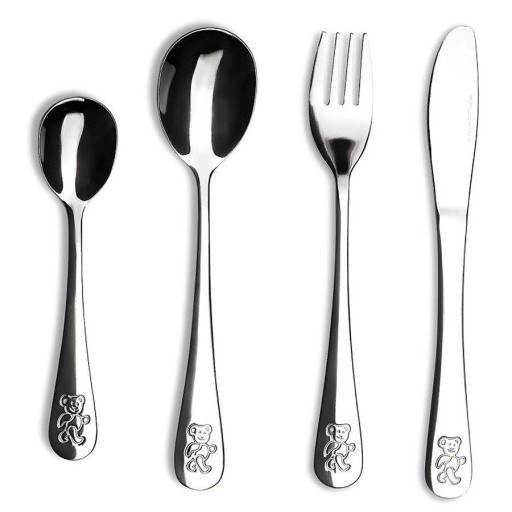 Komplet sztućców Teddy są fantastycznym pomysłem na prezent dla Twojego dziecka (jeśli skończyło już przedszkole). Zestaw 4 elementów zawiera: nóż, widelec, łyżkę i łyżeczkę. Tłoczony na rękojeściach miś zachęca do nauki posługiwania się wszystkimi elementami kompletu. Produkt powstał z wysokiej jakości stali nierdzewnej. Dlatego jest trwały i odporny na uszkodzenia, czy zarysowania. To oznacza, że wytrzyma wszystkie dziecięce zabawy przy stole. Ponadto jest to surowiec w pełni bezpieczny dla zdrowia. Dodatkową zaletą jest możliwość mycia sztućców Teddy w zmywarce.
