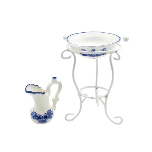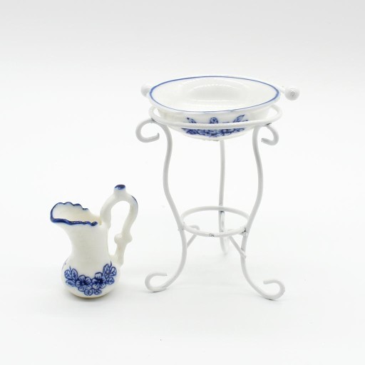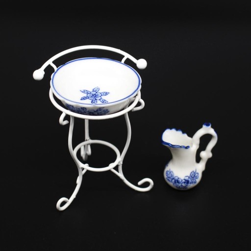 Miniaturowa umywalka i stojak na wodę dla lalek w niebieski kwiatowy wzór