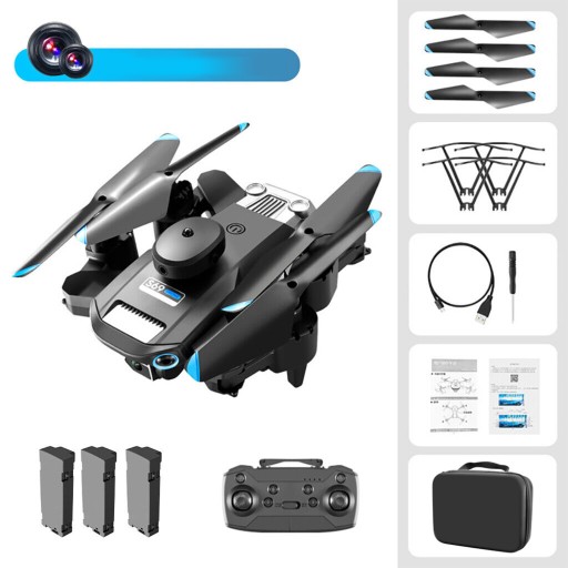 - Zawartość Opakowania: 1x Dron, 1x Pilot zdalnego sterowania, 3x Baterie, 4x Zapasowe łopatki, 4x Ochronne ramy, 1x Kabel ładowania, 1x Śrubokręt, 1x Instrukcja obsługi, 1x Torba na przechowywanie