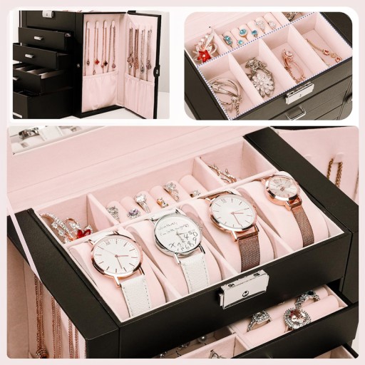 Pudełko na biżuterię i zegarki: Dzięki 4 wyjmowanym poduszkom w górnej warstwie, możesz nie tylko wygodnie i bezpiecznie przechowywać biżuterię, ale także zegarki.