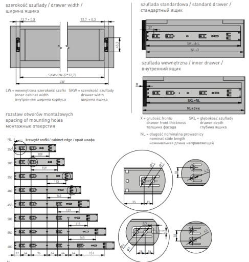- pełny wysuw dostępny w długościach od 300 do 600 mm