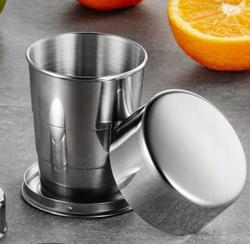 Kieliszek składany jest teleskopowo dzięki czemu zajmuje mało miejsca i idealnie nadaje się jako brelok do kluczy.