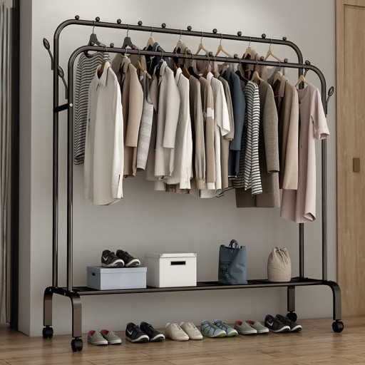 ⏩Podwójny stojący wieszak na ubrania, dzięki któremu zachowasz porządek. Posiada przestrzeń na zawieszenie wieszaków, luźnych płaszczy czy kurtek oraz podstawkę na buty.