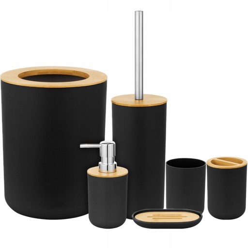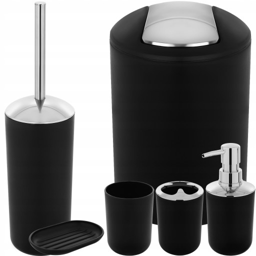 Stylowy zestawy akcesoriów składający się z 6 elementów niezbędnych w każdej łazience. Wyjątkowy desing - połączenie czerni i chromu - doskonale sprawdzi się w nowoczesnych i eleganckich łazienkach.