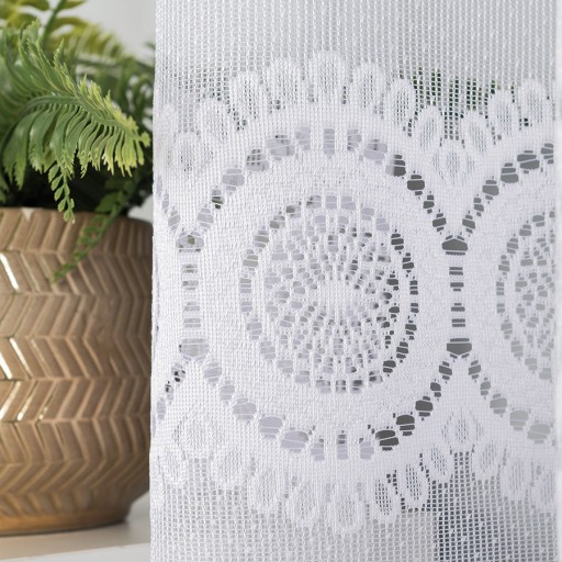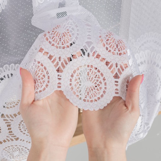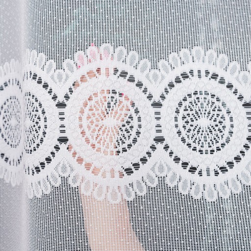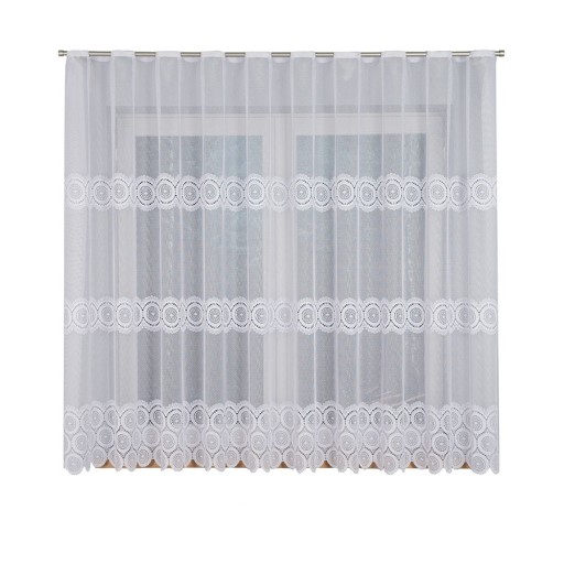 Tkanina żakardowa, z której wykonana jest ta firanka, charakteryzuje się wysoką jakością i trwałością. Jest ona delikatna w dotyku, co sprawia, że firanka prezentuje się bardzo elegancko i subtelnie. Dodatkowo, tkanina ta jest łatwa w utrzymaniu czystości, co pozwala na długotrwałe zachowanie jej pierwotnego wyglądu.
