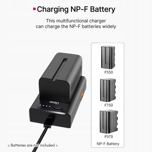 【Ładowarka NP-F】 Ta lekka i przenośna ładowarka jest przeznaczona do ładowania akumulatorów NP-F, takich jak NP-F550/F750/F970.