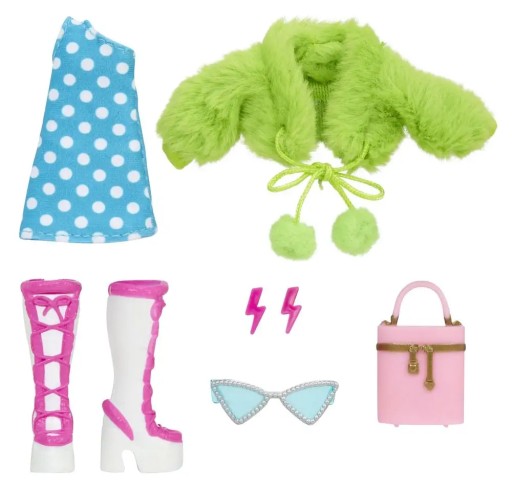- Zawiera modne elementy garderoby: okulary przeciwsłoneczne, kolczyki, limonkową kurtkę z pomponami, róż Soft Hearts Blush, sukienkę w kropki z jednym rękawem, buty i torebkę.