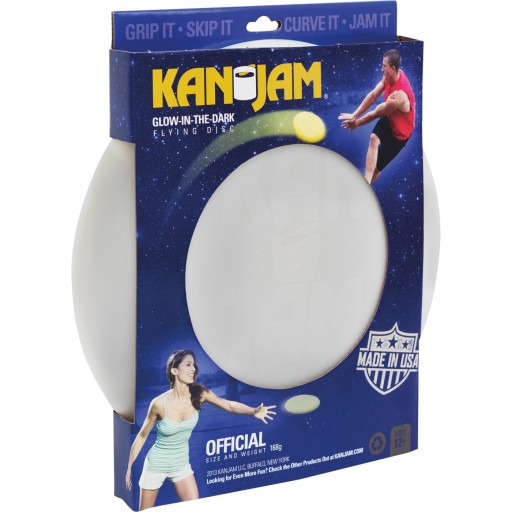 Grać we Frisbee po ciemku? Nie ma problemu z płytą KanJam świecącą w ciemności. Ta oficjalna płyta KanJam dostarczana jest w opakowaniu z kartonu pochodzącego z recyklingu. Świecące w ciemności frisbee KanJam wykonane jest z przetworzonego PVC, waży 168 gramów i ma średnicę 29 cm.