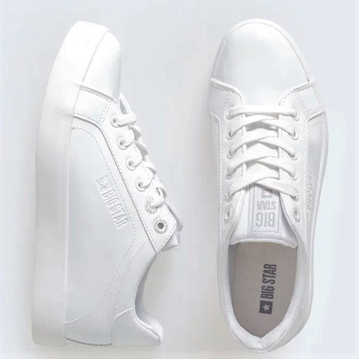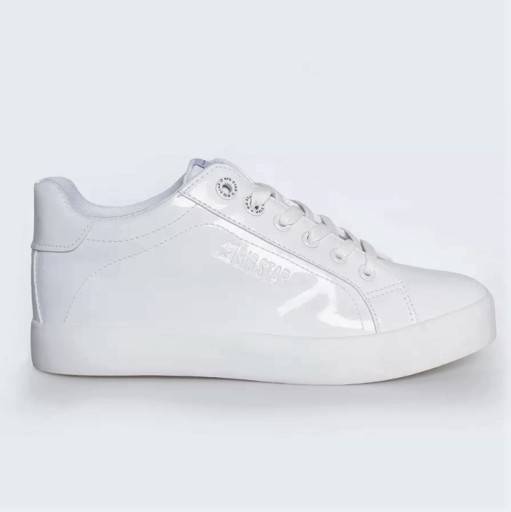 Białe, lakierowane trampki II274039 101 BIG STAR to prosty model, który znajdzie uznanie wśród fanek mody minimalistycznej. Buty mają prosty, klasyczny kształt. Są standardowo sznurowane, mają zaokrąglone noski i stabilną podeszwę z gumy. Damskie buty uzupełniają stylowe przeszycia. Na język, przy białych sznurowadłach dodano białą naszywkę z logo marki. Wkładka i wyściółka są tekstylne. Proste kobiece buty pasują do wielu modnych outfitów z jeansami, ale też np. denimową spódnicą lub bardziej romantyczną sukienką.