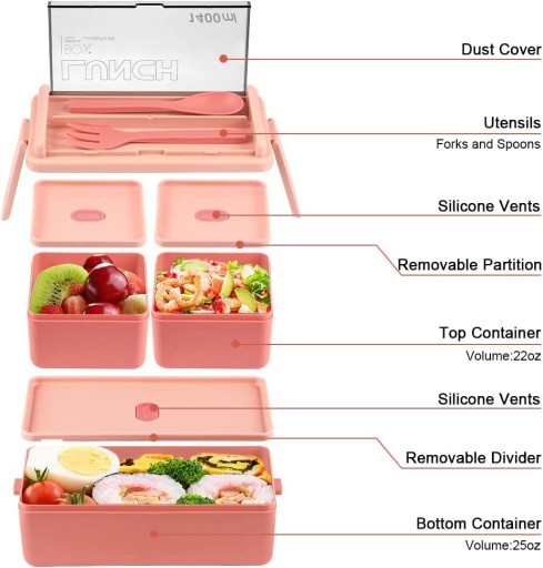 Każdy pojemnik tego wytrzymałego bento lunch boxa ma przekładkę, która ma dobre uszczelnienie. Zaleca się otwarcie zaworu wentylacyjnego przed usunięciem dzielnika, aby zmniejszyć różnicę ciśnienia powietrza między wnętrzem i zewnętrzem pojemnika, co ułatwia otwarcie! (Wskazówka: pudełka bento są lepsze do przechowywania suchych i lekko dusznych potraw).