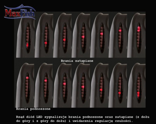- Łańcuch LED jako bazowa sygnalizacja (zróżnicowanie na brania od i do brzegu), kolor czerwony