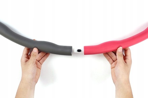 W paczce, w zależności od rozmiaru hula hoop otrzymasz 7 lub 8 fragmentów całej konstrukcji. By połączyć je ze sobą trzeba przytrzymać wciśnięty przycisk i deikatnie wsunąć fragment do otworu kolejnego elementu. Prawda, że proste?