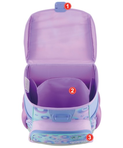 Tornister wyposażony jest w dużą, sztywną komorę z wewnętrzną przegrodą organizującą jego przestrzeń. Przednia kieszeń zapinana jest na zamek. W dwóch kieszeniach bocznych ze ściągaczem bez problemu zmieści się butelka z napojem i drugie śniadanie. Tornister zamyka wygodna w użyciu klamra z odblaskiem.