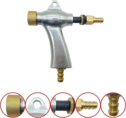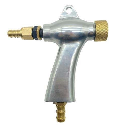 - Wyposażony w złączki widoczne na zdjęciu (złączkę do podłączenia powietrza, złączkę do podłączenia węża do doprowadzenia materiału ściernego)