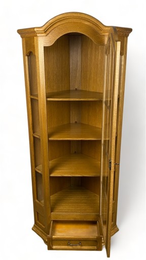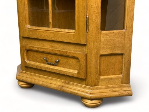 Solidna dębowa witryna narożna w rustykalnym stylu. Mebel nosi normalne, nieznaczne ślady użytkowania, bez istotnych uszkodzeń, jest stabilny. W zestawie klucz do drzwi. Stan bardzo dobry, gotowy do wstawienia.