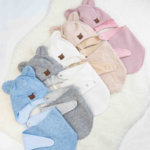 Komplet jest dwuwarstwowy dzięki czemu dobrze zabezpieczy główkę, uszy i szyję dziecka przed chłodem. Jest miękki, pięknie przylega do główki. W zależności od preferencji czapeczkę możesz zawiązać bądź zostawić troczki luzem.