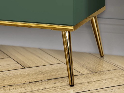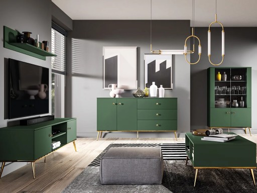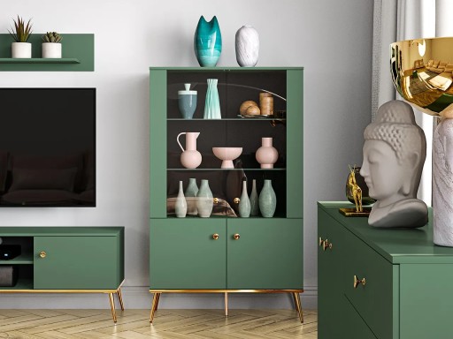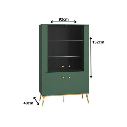 Jej ciemnozielony kolor z subtelnymi złotymi detalami nadaje jej elegancji i wyjątkowego charakteru. Złote nogi i uchwyty dodają meblowi luksusowego wykończenia . Witryna jest szeroka, co umożliwia prezentację dekoracji i cennych przedmiotów.