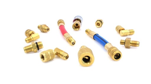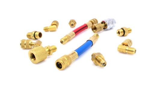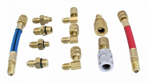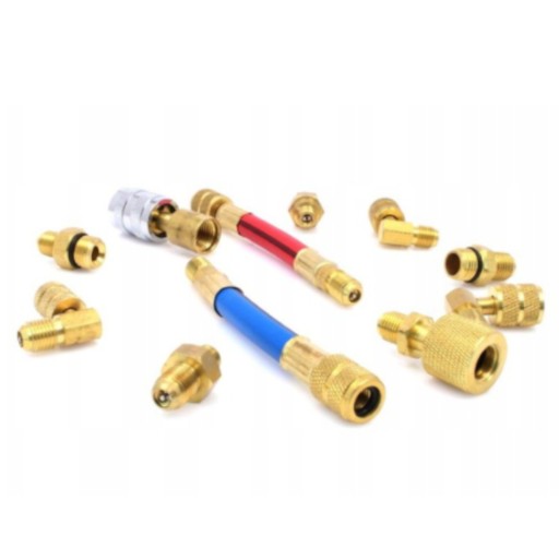 Komplet adapterów, redukcji i wężyków do obsługi układów klimatyzacji wykorzystujących czynnik chłodniczy R134A lub R12.