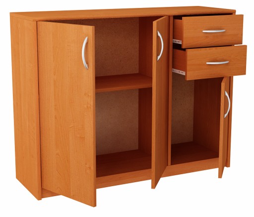 Komoda 3D2S zbudowana jest dwóch szafek, jednej większej z półką i drugiej mniejszej oraz 2 szuflad umieszczonych nad mniejszą szafką.