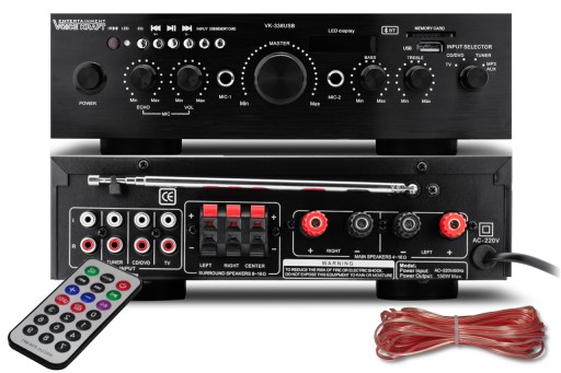 Wzmacniacz posiada moduł BLUETOOTH który pozwoli na odtwarzanie naszej ulubionej muzyki, 4 wejścia RCA, port USB, slot karty SD oraz tuner radiowy FM.