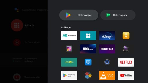 Google Assistant, YouTube, Netflix, Google Play Store, Disney+, Miracast, VLC, HBO MAX, Lemon i inne.