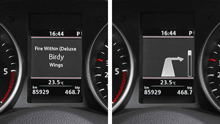 Mały wyświetlacz w zestawie wskaźników jest również podłączony do systemu Alpine i może wyświetlać nazwy stacji radiowych, tytuły utworów i informacje o wykonawcach, nazwiska dzwoniących, szczegółowe strzałki nawigacji i wiele więcej.