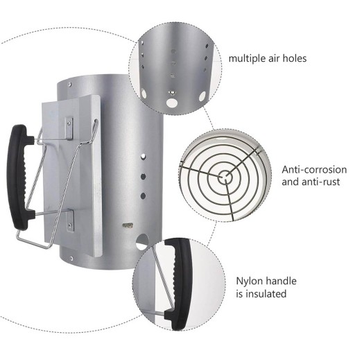 [Łatwy w użyciu]: Rozrusznik kominowy do grilla, wiele otworów wentylacyjnych zapewnia dobrą cyrkulację powietrza, umożliwiając szybki zapłon. Duży otwór pozwala na szybkie i łatwe wsypywanie materiału.