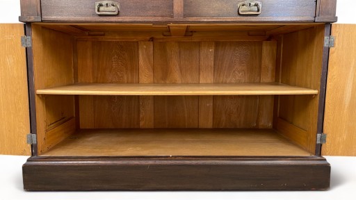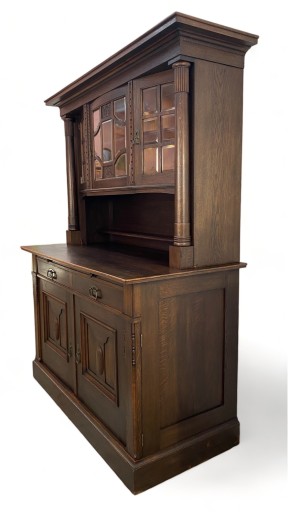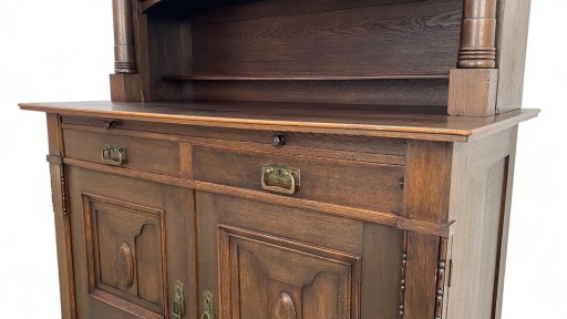 Stary drewniany kredens z przeszkloną nadstawką przyozdobioną stylowymi kolumnami. Mebel nosi normalne, nieznaczne względem wieku ślady użytkowania, bez istotnych uszkodzeń. Jest stabilny, wszystkie drzwi, szuflady oraz pomocnik chodzą płynnie. Ogólny stan bardzo dobry, gotowy do wstawienia.