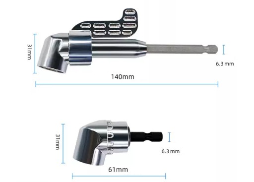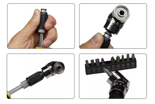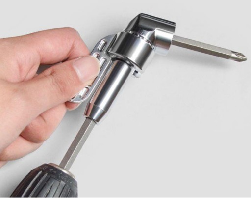 Przystawka do wkrętarki lub wiertarki umożliwiająca wkręcanie i wiercenie pod kątem i w trudno dostępnych miejscach. Płaski uchwyt można dopasować pod dowolnym kątem, tak aby zapewnić pewny chwyt. Uchwyt sześciokątny 1/4 cala.