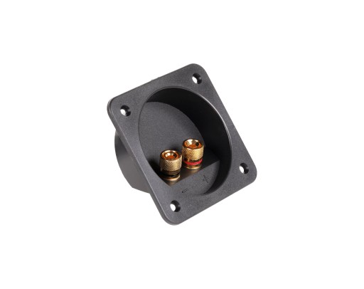 Ten okrągły zacisk głośnikowy do 2-biegunowego połączenia wtykowego ma pozłacane złącza i wymaga średnicy okręgu wiercenia 68 mm.