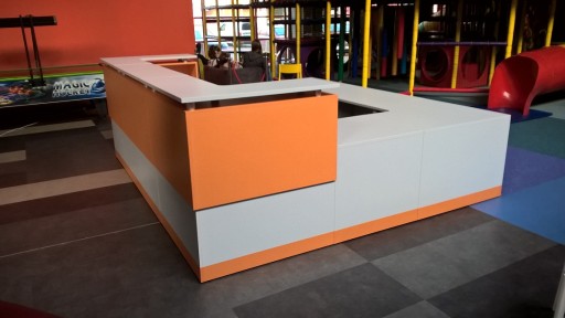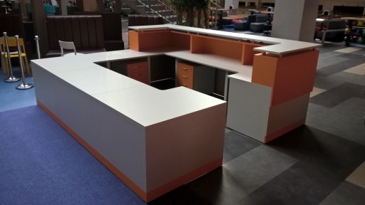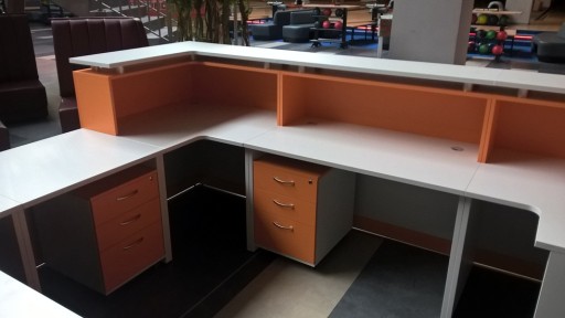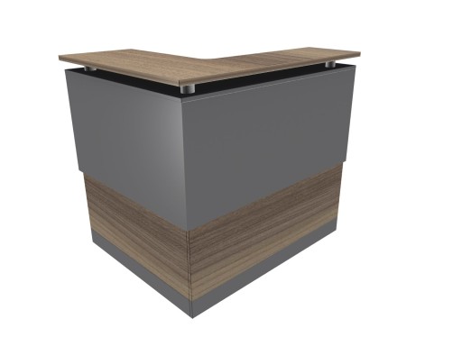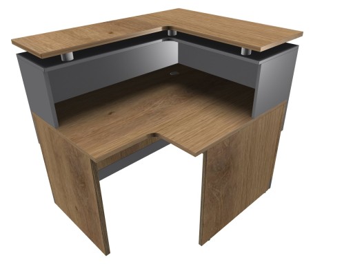 Bardzo gustowna lada narożna wykonana ze znakomitej jakości płyt meblowych. Blat roboczy jak i nogi i blat nadstawki wykonane z płyty o grubości 25 mm. Lada posiada regulowane stopki pozwalające na wypoziomowanie mebla na nierównej podłodze. Top nadstawki wykonany z płyty zamontowany na stopkach o wysokości 50 mm. Blat roboczy o głębokości 700 mm. Nadstawka o głębokości 320 mm i wysokości 358 mm. Lada posiada jedną przelotkę na kable. Lada dostępna w wersji lewej i prawej. Na innych aukcjach dostępna droższa lada z topem szklanym oraz lady proste z tego systemu: niskie i wysokie. Lady występują w bardzo wielu kolorach, które dodatkowo można ze sobą łączyć, stwarzając tym samym niepowtarzalne aranżacje. System lad biurowych, recepcyjnych składa się z bardzo dużej ilości modułów meblowych dzięki czemu w szybki sposób można zaprojektować ustawienie mebli w pomieszczeniach o małej lub dużej powierzchni biurowej.
