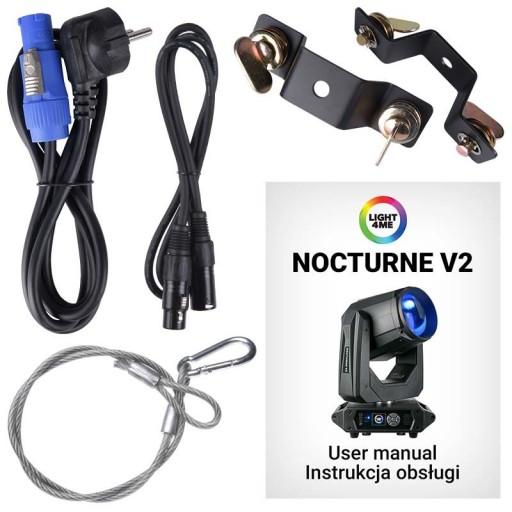 - W zestawie: uchwyty montażowe, linka bezpieczeństwa, przewód zasilający, przewód DMX, instrukcja obsługi (EN/PL)