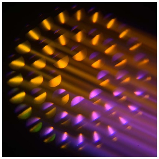 Głowica ruchoma Light4Me Nocturne V2 posiada tarczę, na której znajduje się 12 kolorowych filtrów barwiących światło i mogących dodatkowo tworzyć półkolory oraz efekt tęczy, a także koło wzorów kształtujących wiązkę ze specjalnym wzorem animacyjnym, efektem wody i funkcją gobo shake. Dużym ✅ atutem reflektora jest zestaw 2 pryzmatów oraz możliwość nakładania ich na siebie. Do rozszczepienia wiązki możemy wykorzystać obrotowy pryzmat 8-ścienny oraz rozbudowany pryzmat rotacyjny ze szlifem 8-, 16- i 24-ściennym, który potrafi tworzyć efektowne ruchome rozety świetlne. Całość dopełnia ✅ filtr frost, zmotoryzowany liniowy focus oraz szybki shutter mogący tworzyć efekty stroboskopowe.