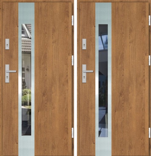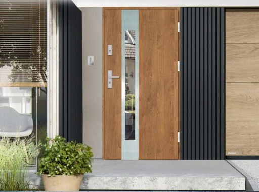 Drzwi wykonane zostały z blachy pokrytej folia dekoracyjną PCV co sprawia, że idealnie pasującą do stolarki okiennej.