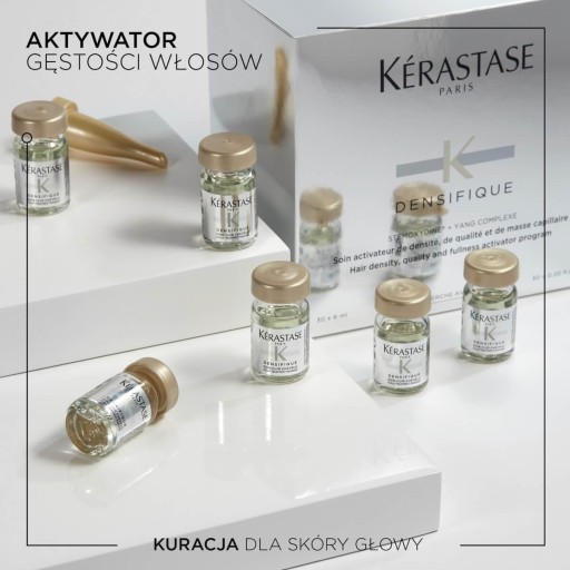 Kérastase Densifique aktywator gęstości włosów Femme Densifique 30x6 ml stymuluje komórki macierzyste, aby kreować większą gęstość i objętość włosów. Bogata formuła na bazie kompleksu Yang, molekuły Stemoxydine®, polimerów oraz witamin B3, B5 i B6 pobudza aktywność mieszków włosowych i poprawia jakość włókna włosa. Włosy stają się widocznie gęstsze i grubsze, a także wzmocnione na całej długości.