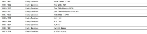 1000 Sportster XLH, 1000 Sportster XLX, 1200 Fat Bob FXEF, 1200 Super Glide FXE, 80 Electra Glide FLH,