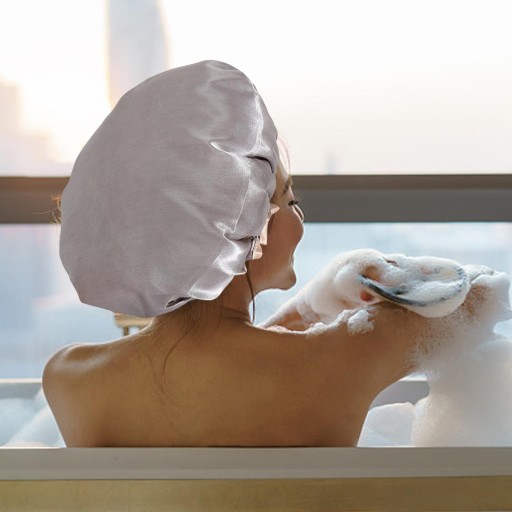 [Dwuwarstwowa konstrukcja]: dwuwarstwowy czepek kąpielowy, elegancka satynowa strona zewnętrzna i wodoodporna podszewka wewnętrzna, mogą skutecznie utrzymywać suche włosy podczas kąpieli pod prysznicem.