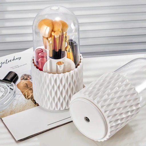 Organizer obrotowy na kosmetyki z pokrywą to elegancki i funkcjonalny dodatek do przechowywania akcesoriów makijażowych.