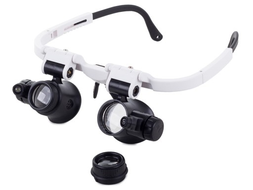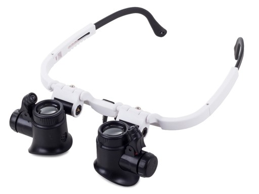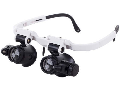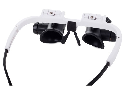 Diodę LED można regulować kąt świecenia w zależności od potrzeb. Cały mechanizm jest oparty w formie okularów na głowę. Można regulować długość nauszników.