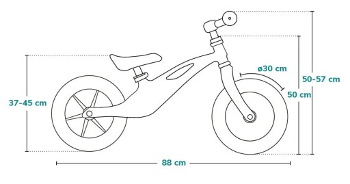 Rama rowerka biegowego Lionelo Bart Air została wykonana ze specjalnego stopu magnezu, co sprawia, że jest nawet o 75% lżejsza od podobnych produktów ze stalową ramą. Działa jak naturalny amortyzator, a przy tym jest wytrzymała i odporna na uszkodzenia. Duże koła (12 cali) z bieżnikiem sprawiają, że rowerek Lionelo Bart Air świetnie trzyma się drogi i płynnie reaguje na ruch kierownicą