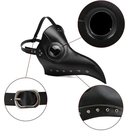 Maska, kapelusz, rękawiczki wykonane ekologicznej skóry w kolorze czarnym z długim dziobem. Mocowana na paskach- dzięki czemu zawsze będzie na swoim miejscu.