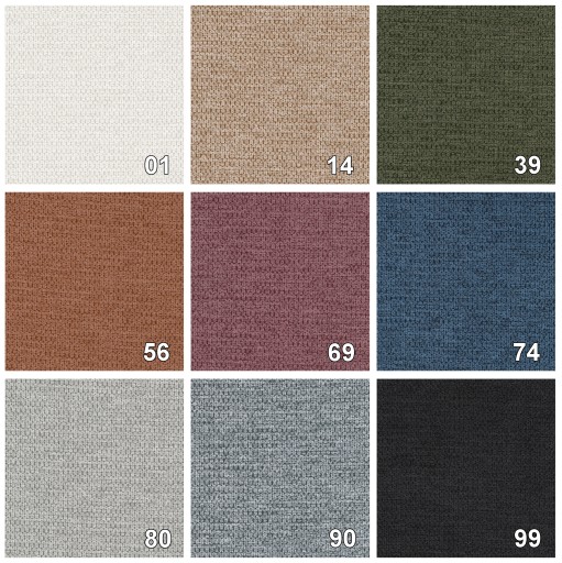 Miękka i przyjemna w dotyku, a zarazem wytrzymała i mocna tkanina welurowa. Charakteryzuje się delikatnym cieniowaniem i delikatną prążkowaną strukturą. Tkanina meblowa o bogatej palecie kolorów odpornej na tarcie, nie mechaci się podczas użytkowania, nie ulega blaknięciu pod wpływem oddziaływania promieni słonecznych.