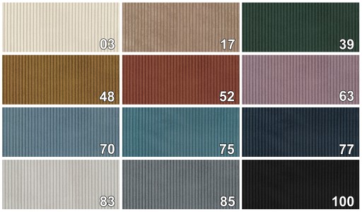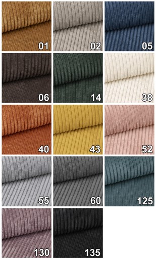 Mocna i wytrzymała a zarazem miękka i przyjemna w dotyku tkanina welurowa o fakturze sztruksu. Łatwa do czyszczenia, oddychająca i odporna na tarcie i działanie promieni UV.