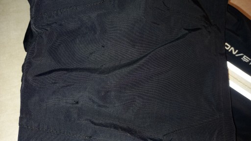 Spodnie mają ślady użytkowania zwłaszcza na prawym kolanie (niewielkie przytarcia materiału i maleńka dziurka - jest to widoczne na ostatnim zdjęciu)